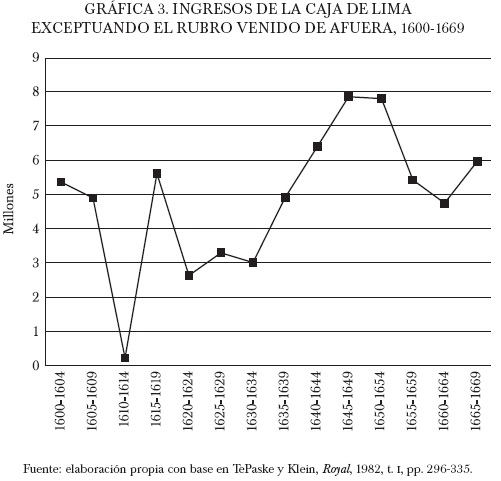 Insistiendo en el aumento de la presión fiscal, es fundamental reparar en el hecho de que estos "nuevos" ingresos correspondieron exclusivamente a la Caja de Lima. Si a las entradas totales de esta caja se resta el rubro "venido de afuera" se constata que el incremento de los ingresos fiscales y financieros de este distrito fue realmente muy importante a partir de 1640 (véase gráfica 3), es decir, cuando se consolidaron las cargas y las prácticas introducidas durante los años del conde de Chinchón. Puesto que en la jurisdicción limeña ni los quintos reales ni los tributos indígenas eran relevantes, el aumento de los ingresos provino especialmente de la actividad comercial, la administración y la Iglesia. Esta última participó, sobre todo, a través de los mecanismos financieros.32