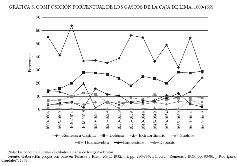 En la coyuntura específica de la primera mitad del siglo XVII, los gastos defensivos de la Caja de Lima constituyeron uno de los apartados fiscales que mayor incidencia tuvo en la distribución de los egresos de esta tesorería. Esta circunstancia se fue acentuando conforme avanzaba la centuria y se reducían las remesas, tanto las exteriores a Castilla como las internas a los distritos mineros, convirtiéndose en uno de los ramos sobre el cual descansaba la posibilidad de enviar más o menos plata a España. De hecho, las erogaciones propias de la estructura bélica del virreinato no rivalizaban con ninguna otra, a excepción de las remesas a la península. Con estas últimas, en cambio, tenían una estrecha relación, que quedó de manifiesto con el movimiento que experimentó cada uno de estos ramos durante las décadas del valimiento de Olivares.