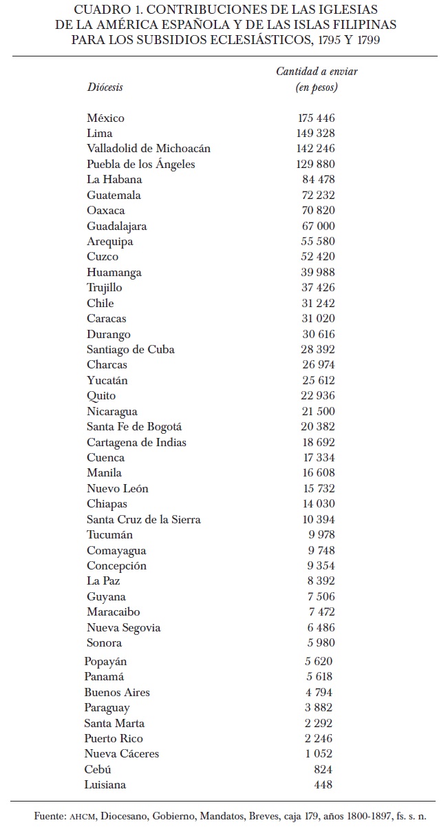 Al final de cuentas, pues, la Iglesia michoacana fue la tercera más gravada de las de América, con los antedichos 142 246 pesos en cada subsidio, sólo por debajo de las iglesias de México y de Lima, que pagaron 175 446, la primera, y 149 328, la segunda, en cada una de las remesas en las que se dividió aquella nueva carga fiscal. En la prorrata formada para el pago de subsidios se advierte el orden de importancia económica que, en los últimos años del siglo XVIII, cada Iglesia ultramarina tenía para la Real Hacienda española; y así como todos los ramos e instituciones eclesiásticas de cada diócesis debieron participar con cierta cantidad de dinero, así todas las iglesias de la América española y Filipinas contribuyeron, sin excepción, según sus posibilidades y siguiendo aquel orden de importancia. De esta manera vemos que, inclusive, diócesis pobrísimas y que se sostenían con los diezmos que otros obispados les proporcionaban por la vía de pensiones y diezmos eclesiásticos como Luisiana, Cebú y Nueva Cáceres contribuyeron para los famosos subsidios (véase cuadro 1).