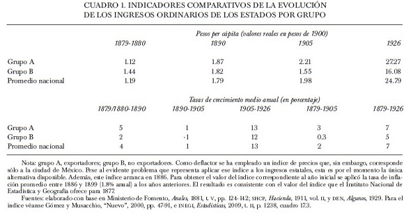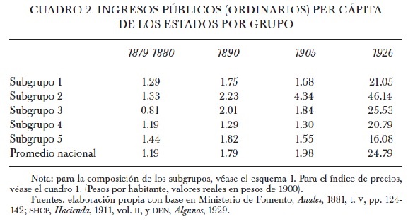 Cabe hacer notar, en primer lugar, que en el año inicial los subgrupos uno al cuatro (correspondientes a estados que eran o se volverían exportadores) registraban, cada uno, ingresos públicos por habitante inferiores al subgrupo cinco. Esta situación empezó a revertirse desde 1890 para algunos subgrupos hasta que, en 1926, ninguno registraba ingresos públicos inferiores a los del subgrupo cinco. Sin embargo, también entre los subgrupos exportadores existían diferencias significativas que de hecho se ampliaron con el paso del tiempo.