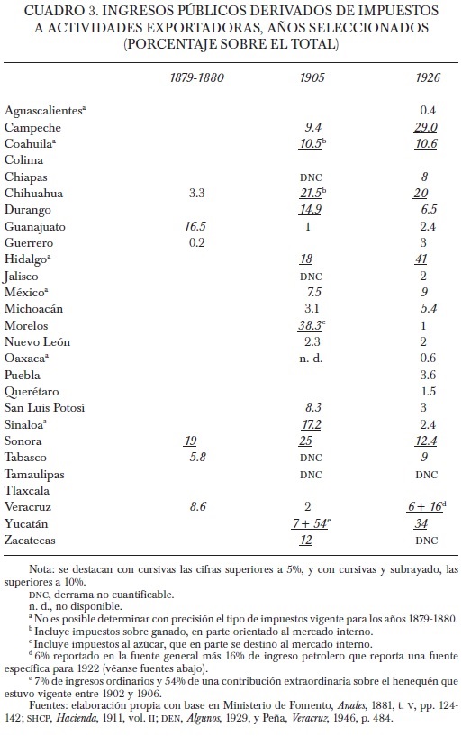 En cuanto a los datos empleados para 1926, la fuente reporta dos tipos de impuestos que sugieren una relación con las actividades exportadoras: "impuestos sobre recursos naturales" e "impuestos sobre productos regionales". Como los primeros constituyen un paralelo exacto de los impuestos federales que llevaban el mismo nombre, sabemos sin lugar a dudas que afectaban a la minería y al petróleo. En cambio, los segundos no corresponden inequívocamente a productos de exportación. No obstante, la fuerte incidencia de esta fuente de ingresos en los estados exportadores (Campeche, Chiapas, Yucatán, etc.) y su insignificante o nula presencia en los que no poseían esa especialización (Colima, Morelos, Tlaxcala) dejan poco lugar a dudas sobre su origen. En cualquier caso, existe la posibilidad de que en este rubro participen, además de los artículos de exportación, otros orientados al mercado interno, lo cual entraña un pequeño margen de error (pequeño por la importancia relativamente menor de esta fuente de ingresos en estos casos en particular); con estas reservas véase el cuadro 3.