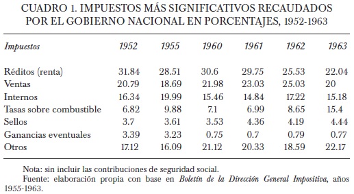 Una de las características de esa crisis fue la erosión de las capacidades del Estado, incluida la capacidad fiscal. Entre 1955 y 1976 el gobierno nacional (y también los provinciales) vivió en una situación de déficit permanente. Los impuestos apenas alcanzaban a cubrir dos tercios de los presupuestos ordinarios. Estos no incluían cuentas especiales y gastos de deuda el pago de la deuda que en 1957 había representado 0.6% de los ingresos del tesoro nacional en 1972 suponía más de 7%. Sofisticados instrumentos de tributación directa y progresiva que habían comenzado a aplicarse por el gobierno nacional desde la década de 1930, como el impuesto a los réditos a la renta, el impuesto a los beneficios extraordinarios o el impuesto a las ganancias eventuales, se vieron profundamente afectados por la inflación, el abrupto ciclo económico y el avance de la desconfianza social hacia las instituciones. Los impuestos progresivos que habían llegado a representar casi la mitad de la carga tributaria a finales de la década de 1940 cayeron hasta 40% y en ocasiones a 30% del total recaudado por impuestos por el tesoro nacional. El gobierno buscó alternativas en el aumento de la imposición regresiva o el recurso al endeudamiento y la inflación.2