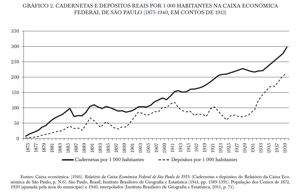 A Caixa Econômica de São Paulo foi criada em 1875. A tendência inicial de crescimento das cadernetas e depósitos mostrou-se expressiva. A crise no final do Império foi mais notória no caso paulistano, bem como a crise do final do século XIX em face a preços menores do café naquele momento. Posteriormente, a recuperação da tendência de crescimento foi bastante expressiva no início do século XX até a primeira grande guerra, reproduzindo o vigor da economia paulistana nessa época. A guerra reduziu fortemente os valores reais dos depósitos e se manteve em patamares reduzidos durante a década de 1920, recuperando somente durante a grande depressão, como ocorreu na Caixa do Rio.20 As cadernetas não apresentaram tal retração e continuaram a aumentar em termos da população até o final do período, havendo apenas uma pequena diminuição durante a crise do início dos anos 1930. Apesar das diferenças entre a série de número de cadernetas e valores reais depositados, elas correlacionaram-se fortemente em todo o período em consideração (0.948).