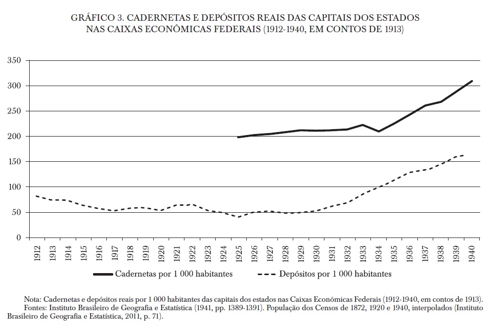 As caixas econômicas públicas foram importantes na captação de depósitos desde a sua criação a partir de 1861 pelo governo imperial e posteriormente pelos estados. Embora a maior parte dos habitantes morasse no campo, as principais capitais provinciais e depois estaduais realizaram elevada proporção de cadernetas de poupança e depósitos em relação à sua população. De forma semelhante, os depósitos das Caixas representaram parcela relevante dos depósitos bancários, comparativamente aos do Banco do Brasil que se expandiram expressivamente nas primeiras décadas do século XX. Após um período de estagnação, a crise dos anos 1930 e a reorganização das Caixas possibilitaram a retomada do crescimento dos seus depósitos.