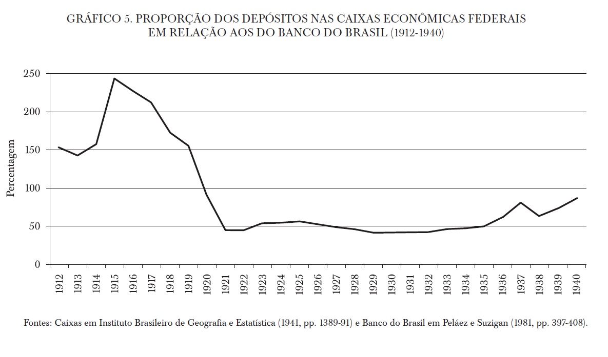 Apesar da grande expansão do Banco do Brasil, as caixas mantiveram depósitos na proporção de cerca da metade do novo banco durante a década de 1920. Por fim, a reorganização das caixas nos anos 1930 permitirá um crescimento expressivo dos seus depósitos, mesmo em relação ao Banco do Brasil que também foi muito atuante nessa época. Assim, verificamos a grande relevância das caixas desde o século XIX em termos dos depósitos relativamente a outra instituição de porte da época.