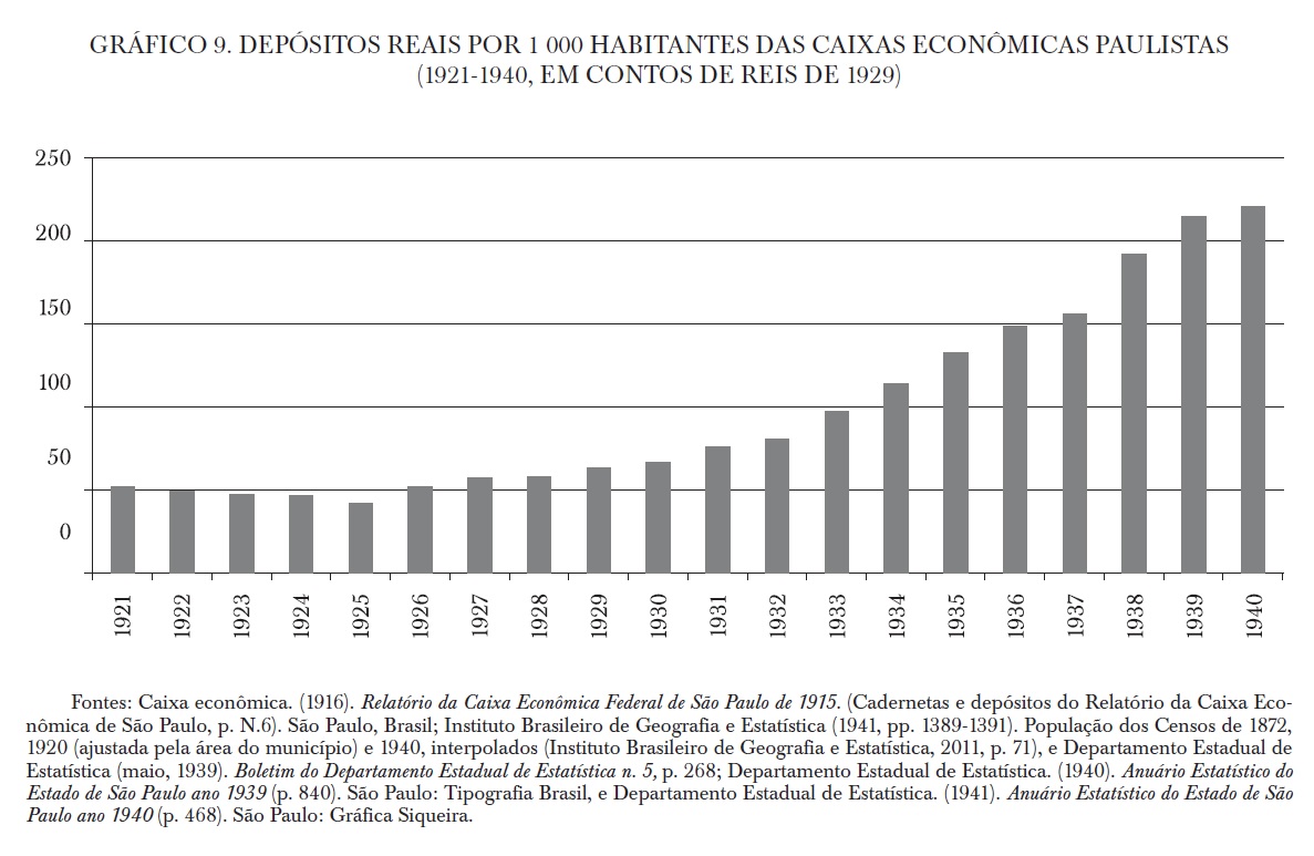 11 Em 1912, São Paulo detinha 19.7% dos depósitos das caixas, Rio Grande do Sul 10.7% e Pernambuco 7.3%. Em 1930, São Paulo perfez 29.4% dos depósitos das caixas, Pernambuco 5.5% e o Rio Grande do Sul 4.2% (ver Instituto Brasileiro de Geografia e Estatística, 1941, pp. 1390-1391).