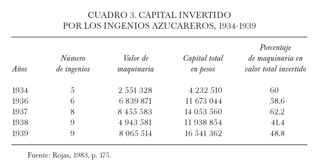 A lo anterior se sumó la introducción de maquinaria en el sector agrícola por parte de los dueños de los ingenios. Aquí nuevamente nos encontramos con el caso de La Manuelita, en donde se introdujeron los primeros tractores "mecánicos de 2 a 3 rejas cada uno, y un arado de vapor de 6 rejas" (Valencia, 1921a, p. 308), se adecuaron las distancias entre las plantas, se construyeron drenajes, se redujeron los cortes menores a 16 meses y se utilizaron nuevas cepas y variedades de caña, reemplazando las llamadas cañas moradas de Borbón, y también se optimizó el uso del agua. Se infiere, por tanto, que se produjo una mayor capacidad de ahorro de los dueños de las empresas, así como su disposición para gastar los dividendos de rentabilidad en bienes de capital. En el cuadro 3 se muestran los volúmenes de inversión hechos en este renglón entre 1934 y 1939, periodo de gobierno de López Pumarejo y coincidente, también, con el tema de la expansión territorial.