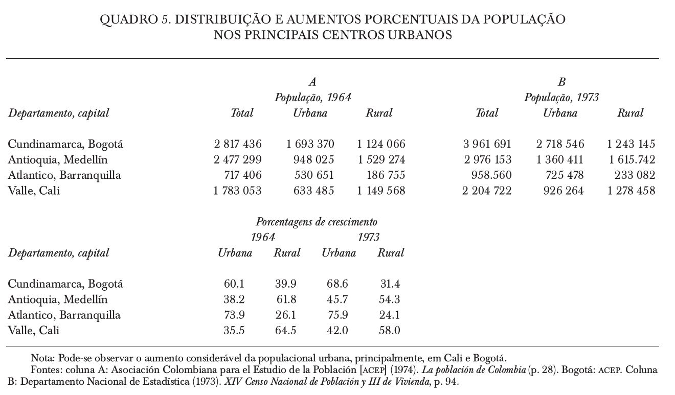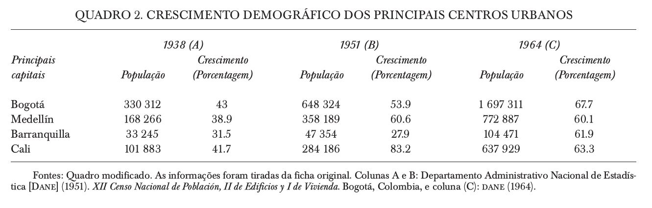 No contexto latino-americano, produto do pós-guerra mundial, muitos dos centros urbanos evidenciaram um acelerado processo de urbanização, derivado dos deslocamentos da população urbana (de pequenos povoados) e rural constituídos como 60% do total da população (Currie, 1961a, p. 2). Na Colômbia, foi o momento da modernização do setor agropecuário e o arranque do desenvolvimento capitalista, incluindo o setor da construção. Embora este panorama fosse positivo para alguns setores da economia, o país não foi alheio ao processo que experimentava América Latina: um exacerbado índice de crescimento demográfico, um aumento desigual na distribuição de terras e ingressos, concentração da propriedade rural no campo, expansão da fronteira agrícola, desemprego e, sobretudo, as migrações rurais e urbanas pelas quais a população camponesa fugia da violência gerada pelas diferenças partidárias entre liberais e conservadores (Bejarano, 1991, p. 210) (ver quadro 1).
