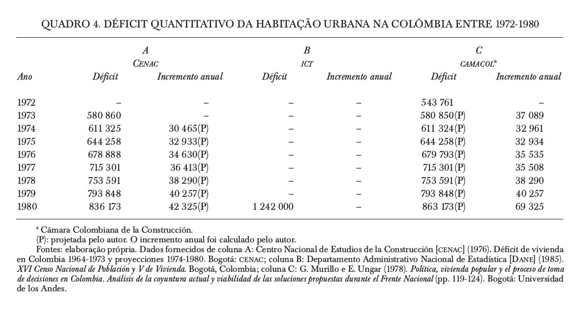 Porém, o mais importante das instituições foi a sua intencionalidade por mitigar o acelerado déficit habitacional e de serviços públicos como resposta às mais de 60 000 novas famílias anuais que chegavam aos principais centros urbanos, entre 1960 e 1970 (DANE, 1973); todas carentes de domicílio. O acelerado déficit, que desde 1950 até 1972 tinha aumentado mais de oito vezes, era cada vez mais crítico; como consequência da baixa capacidade edificadora do Estado em relação às altas taxas de crescimento da população urbana, cujo aumento estava entre 1950 e 1960 em torno de 6.6% (ver quadro 1) e, entre 1960 e 1970, foi de 7.2% (ver quadro 4). O que evidencia uma incapacidade das famílias para demandar uma habitação e a impossibilidade da estrutura econômica para produzi-la. A magnitude e realidade do fenômeno ajudam a compreender a implementação de constantes mudanças nas políticas públicas de habitação na Colômbia durante este primeiro período.