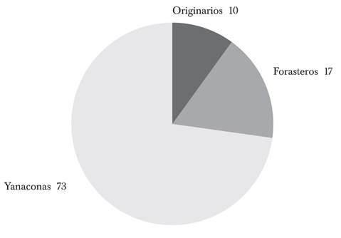 Si observamos el conjunto de la población indígena registrada en las Memorias de los curas, en Chichas hay un claro predominio de los originarios, acompañado de una importante presencia de forasteros, mientras casi no existían yanaconas.