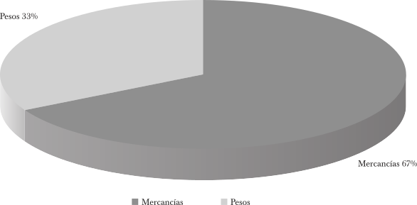 GRÁFICA 1. PESOS Y MERCANCÍAS EMBARCADAS PARA FILADELFIA POR DOBIGNIE A RIESGO DE S. GIRARD, 1800