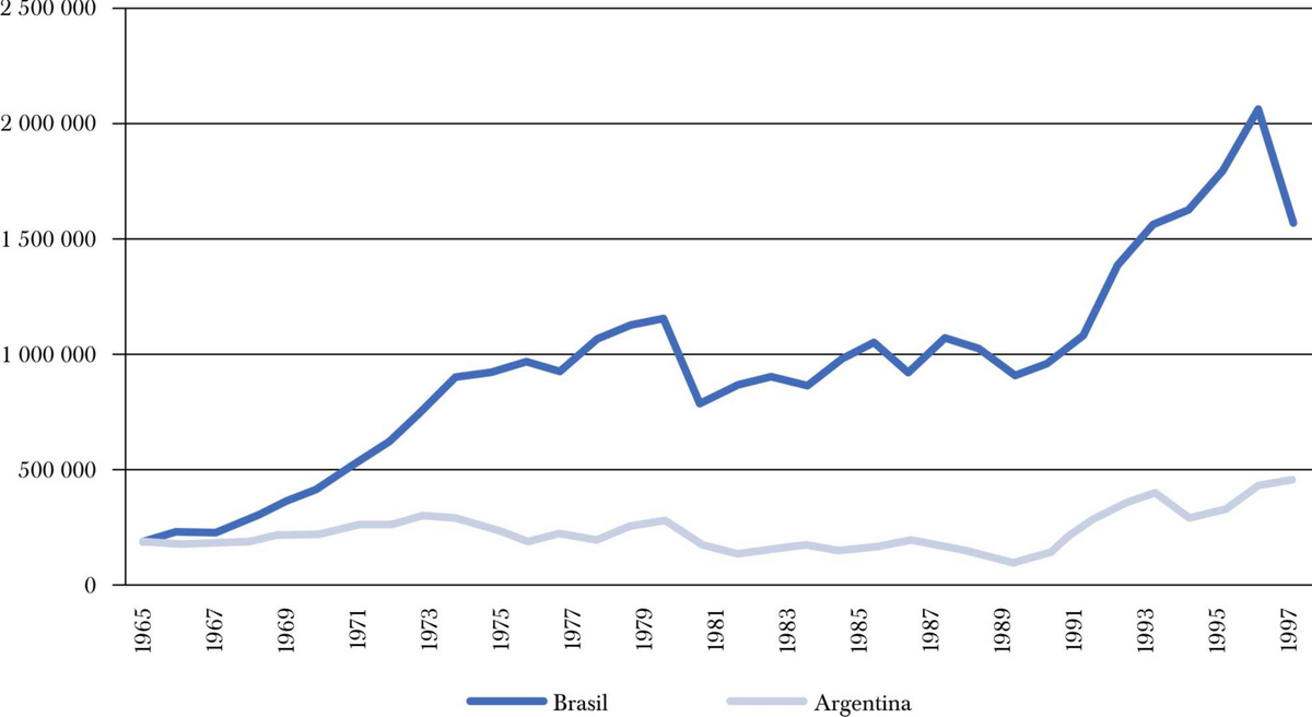Cabe señalar que la reconversión y el posterior ajuste de Fiat en el país se da muy poco tiempo después del desembarco de la multinacional en Brasil, mercado que se encontraba en pleno crecimiento (véase gráfica 4). Fiat Automóviles comienza sus operaciones oficialmente en Brasil en 1976,28 inaugurando la fábrica de Betim (Minas Gerais),29 la primera ensambladora de autos que se instaló fuera de San Pablo (Carvalho y Bernardes, 1998). Esta reorientación también trajo aparejado un importante cambio a nivel regional: la creación de una dirección latinoamericana, con sede en Río de Janeiro, que adoptó las decisiones que previamente se concretaban desde Turín (sede central).30 Este proceso se da concomitantemente con una expansión de la producción automotriz brasileña en comparación con la argentina, que de fabricar cantidades similares a mediados de 1960 termina produciendo cuatro veces más hacia fines de 1980.