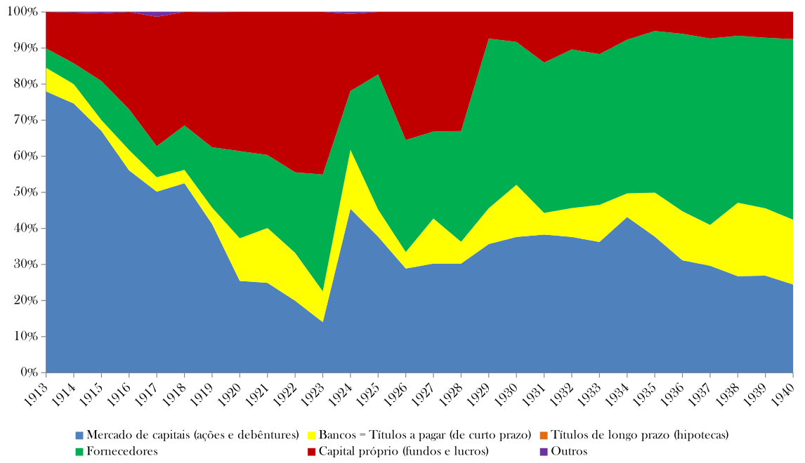 De forma geral, ao longo do período entre 1913 e 1940, observa-se grande importância inicial do mercado de capitais (ações e debêntures) no início da década de 1910, com mais de 50% do total das fontes de financiamento da empresa até 1918. Depois desse período há uma queda significativa (para 14%) da participação relativa do mercado de capitais até 1923, dando lugar para o crescimento do financiamento pelo capital próprio (para 45% do total das fontes de financiamento) e fornecedores (32%). Em 1924 ocorreu recuperação relativa do mercado de capitais que se manteve entre 25% e 40% das fontes totais do financiamento da firma até 1940. A partir de meados dos anos 1920 ocorreu um crescimento relativo (de 31% em 1926 para 50% em 1940) dos fornecedores e queda (de 35% em 1926 para 7% em 1940) do capital próprio como fonte de financiamento da firma até o final do período estudado. Com relação aos bancos sempre tiveram importância marginal (menos de 20% do total dos recursos) no financiamento da firma, apesar de aumento relativo nos anos 1930.