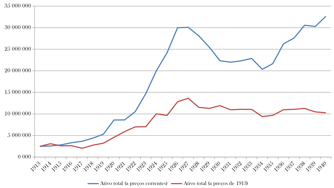 Não ocorreu expansão do ativo total da companhia na década de 1930 (gráfico 2). Entre 1934 e 1935 há uma queda mais expressiva, mas logo recuperada, já no ano posterior. Contudo, o valor dos ativos totais da companhia (a preços de 1913) terminaria o ano de 1940 quase que no mesmo patamar registrado em 1925. Assim, pode-se concluir que, em 15 anos, o ativo da companhia não teve evolução considerável entre meados dos anos 1920 até 1940.