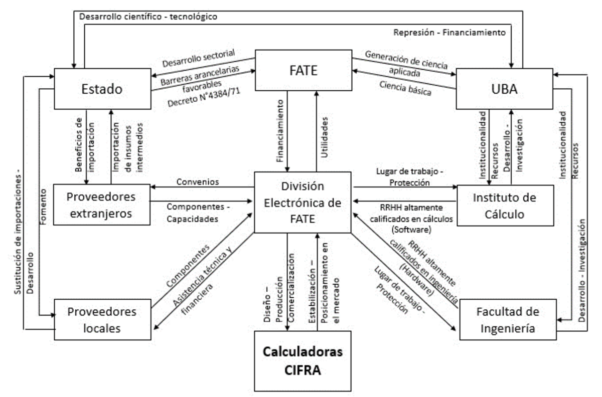 Los funcionarios de fate generaron las condiciones institucionales –con la creación de la División Electrónica y la previa Gerencia de I+D– y económicas para el desarrollo de artefactos del sector electrónico y su expansión en términos empresariales. Los directores y gerentes de la División Electrónica no solo se incorporaron como recursos humanos altamente calificados para el desarrollo de bienes conocimiento-intensivos, sino que lograron coordinar parte de la alianza para el diseño y producción de la línea Cifra. Los funcionarios del gobierno nacional sostuvieron políticas de protección de la industria privada local y generaron incentivos específicos para la producción de las calculadoras electrónicas, además de alentar la provisión de los componentes locales y facilitar el abastecimiento de los importados. Los proveedores locales recibieron apoyo técnico y financiero, lo que les permitió adquirir nuevos conocimientos y expandir la trama sectorial, mientras que los proveedores extranjeros lograron convenios para ingresar sus productos al país (imagen 2).