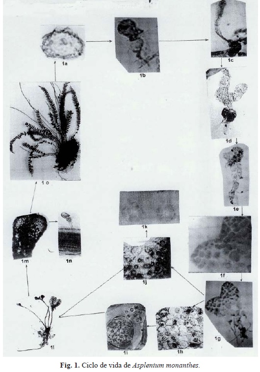 Ciclo de vida de Asplenium monanthes L. Presenta esporas monoletes de color café claro, de forma ovada de 33.1 a 50.1 Lim de largo por 22.8 a 32.9 µm de ancho exina con tres capas, la perina de 1.7 a 2.5 L m de grosor, sexina de 1.8 L m de espesor, equinada y nexina menor de 1 µm de grosor (Fig. 1a).