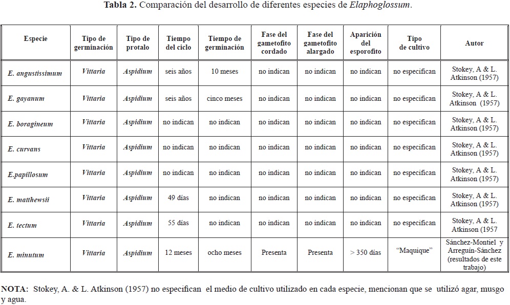 Las primeras etapas del ciclo de E. minu-tum no se tienen, ya que la germinación duró ocho meses y se pensó que tal vez las condiciones no eran adecuadas, por lo que se suspendió la revisión periódica de los frascos. Posteriormente, a los ocho meses después de la siembra, al observar unos filamentos verdes se decidió seguir la toma de muestras, se encontró que el gametofito en sus inicios es de forma cordada, y conforme el gametofito va madurando la forma cordada va desapareciendo adoptando una forma alargada; en la bibliografía (Stokey y Atkinson, 1957) hacen referencia a que existen especies que pueden presentar el tipo cordado y posteriormente ser del tipo alargado pero no ocurre el caso contrario. En Elaphoglossum minutum el gametofito posee numerosos rizoides en la parte ventral, dorsal y marginal, el margen presenta ondulaciones. El desarrollo del ciclo de manera general es muy lento.