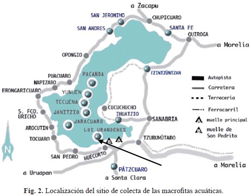 Los ejemplares de Lemna gibba, Eichhornia crassipes e Hydrocotyle ranunculoides se colectaron en época de lluvias en la zona conocida como Los Urandenes que se localiza al sur del lago de Pátzcuaro, Michoacán (Fig. 2). La colecta de las plantas se llevó a cabo manualmente, utilizando bolsas de plástico para mantenerlas con una determinada cantidad de agua, éstas se colocaron en una hielera de plástico para transportarlas hasta el laboratorio. Se cultivaron por triplicado en medio nutritivo Hoagland diluido 1/40 en palanganas de plástico, con 2 000 ml de volumen total y 100 g de plantas en peso fresco (Miranda e Ilangovan, 1996). Se mantuvieron con un fotoperiodo de 12/12 horas luz-oscuridad y una temperatura entre 19° y 21°C, el pH se mantuvo en un valor de 7. Después de una semana de aclimatación se montaron los bioensayos. De acuerdo a Taiz y Zeiger, 1991, la concentración óptima de Cu determinado en biomasa seca de plantas es de sólo 6 mg/L. Sin embargo, Jain et al., 1989 y Low et al., 1994 reportan que tanto la lenteja de agua como el lirio acuático acumulan niveles altos de Cu. Debido a lo anterior las concentraciones probadas en este estudio fueron de 50 y 100 mg/L de Cu en forma de (Cu2SO4 5H2O). Se usaron las mismas condiciones de luz y temperatura de la aclimatación. Los bioensayos se realizaron por triplicado y se mantuvieron durante cinco días, después de los cuales se determinó el contenido de clorofilas que fue evaluado por el método colorimétrico de Arnon (1949) y el contenido de azúcares fue determinado por el método colorimétrico de Dubois, et al. (1956).