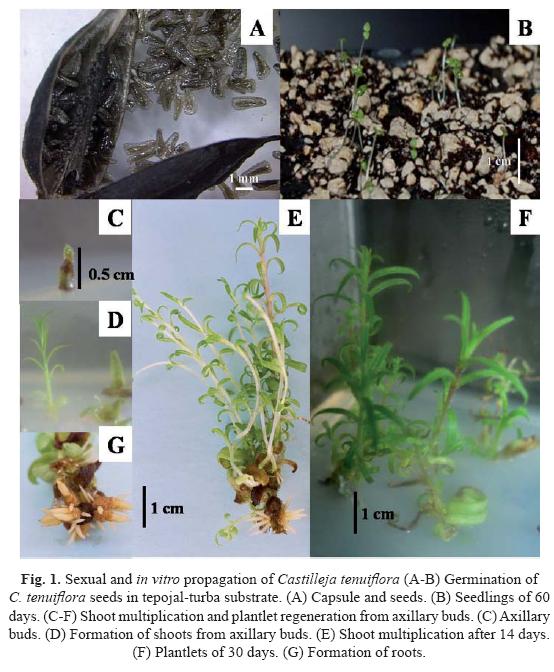 Castilleja tenuiflora is not cultivated and information on its natural propagation is lacking in the literature. Other species of the genus such as C. levisecta (Lawrence, 2005), C. scabrida or C. miniata (Meyer and Carlson, 2004) reproduce by seeds. However, seeds are highly dormant at harvest, germination is slow, emergence is nonuniform and seedlings are very small and fragile. Moreover, reports of other species of Castilleja suggest that the hemiparasitic nature may be an obstacle for its cultivation because this genus relies on a root connection with a host plant as a source of inorganic and organic nutrients as well as water (Meyer and Carlson, 2004). Therefore, dormancy of seeds combined with the lack of a host plant may be limiting for seed propagation. Axillary bud culture represents a useful technique for the rapid multiplication of recalcitrant species with the advantage of producing individuals identical to mother plants. This technique has been successful for some Scrophulariaceae such as Bacopa monniera (Tiwari et al., 2001) and Isoplexis canariensis (Arrebola et al., 1997).