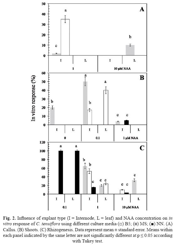 Rhizogenesis was observed in the three culture media in both explants but only when NAA was used (0.110 µM) (Fig. 2C). The highest root formation (100%) was achieved with the lowest level of NAA (0.1 µM) and NN culture medium (p < 0.05); explant type did not influence rhizogenesis in this case (p > 0.05). In contrast, internodes exposed to 1 µM NAA were more competent than leaves to form roots (p < 0.05) regardless of culture media. Similar to that observed with caulogenesis, the increase in NAA concentration had a negative effect on rhizogenesis (p < 0.05). Our data show that rhizogenesis depends on exogenous NAA but auxin requirement varies according to the culture medium and explant used. Results clearly indicate that culture media, explant type and NAA concentration influenced the in vitro response of C. tenuiflora. The interaction between auxin, culture medium and explant type has been previously reported in other plant species such as Bacopa monnieri (Scrophulariaceae) (Tiwari et al., 1998) or Pinguicula lusitanica (Gonçalves et al., 2008). MS and B5 media offer more alternatives than NN for developing callus or organs, but NN is highly efficient for inducing rhizogenesis. In a complementary manner, internodes were more competent than leaves for both callugenesis and organogenesis, along with the fact that leaf explants oxidized easily (> 60% of the explants). For these reasons, the following experiment was performed using internode explants with MS and B5 medium.