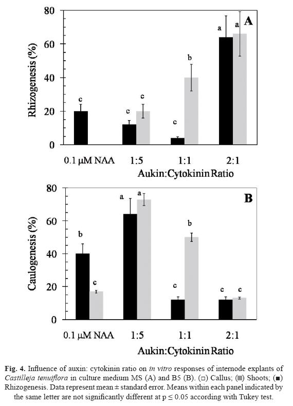 To test the infl uence of different auxin:cytokinin ratios on in vitro response, the auxin NAA (0.1 µM) was combined with the cytokinin KIN (00.5 µM). From the above results and considering the occurrence of all in vitro responses, this experiment was done using only MS (formation of shoots and roots) and B5 media (formation of callus). It was observed that rhizogenesis tends to increase as auxin:cytokinin ratio increased (Fig. 4A). The highest yield of rhizogenesis (65%) was observed with the highest auxin:cytokinin ratio (2:1, 0.1 µM NAA + 0.05 µM KIN) (p < 0.05). Moreover, the low levels of KIN (0.05 and 0.1 µM; ratios 2:1 and 1: 1, respectively) had a positive effect on rhizogenesis (p < 0.05) because the yields were higher (p < 0.05) than those obtained when NAA was used alone. However, rhizogenesis was similar with 0.1 µM NAA used alone or combined with 0.5 µM NAA to give an auxin:cytokinin ratio of 1: 5 (p > 0.5).