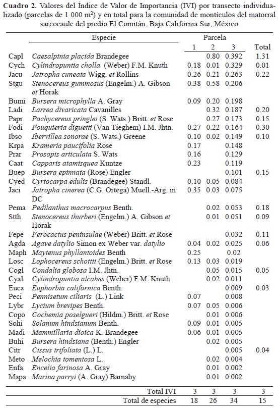 El cuadro 2 muestra la jerarquización de las especies con base en su índice de valor de importancia (IVI) por sitio y considerando los tres sitios de muestreos como uno solo (total). Se observa que algunas especies revelan altos valores sólo en uno de los sitios de muestreo, pero en otros no resultaron relevantes o incluso ni siquiera fueron registrados. Para el sitio 1 la especie con mayor importancia de acuerdo al IVI fue la pitaya agria, Stenocereus gummosus (Engelm.) Gib. et Horak (Stgu), mientras que Caesalpinia placida Brandegee (Capl) lo fue en los sitios 2 y 3. La especie que resultó con homogéneo nivel de importancia para los tres sitios es la matacora Jatropha cuneata Wigg. et Rollins (Jacu). Estos datos concuerdan con la diagnosis de este tipo de vegetación en la escala regional del sur de la península (León de la Luz et al., 2000), en donde se ubican como dominantes las formas suculentas y semisuculentas acompañadas por leguminosas leñosas (en este caso particular C. placida Brandegee y Prosopis articulata S. Wats.).