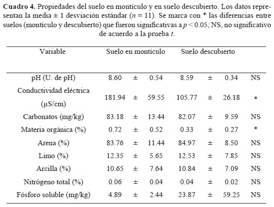 Analizando las propiedades de suelo descubierto y suelo de los montículos, en esta investigación se encontró que, de las nueve variables de suelo comparadas, sólo dos resultaron ser significativamente distintas: la salinidad y el contenido de materia orgánica (cuadro 3). La mayor concentración de sales solubles en los montículos, estimada indirectamente a través de la conductividad eléctrica, puede ser explicada como el resultado de la acumulación de la hojarasca o litter, la cual al descomponerse libera sales que son lixiviadas hacia el suelo tal y como lo describen Rostagno et al. (1991). El mayor contenido de materia orgánica en los montículos, en contraste con las áreas adyacentes desprovistas de vegetación, puede explicarse: (1) por la producción de hojarasca de los mismos componentes del montículo que se acumula y mineraliza in situ; (2) por la actividad de la fauna, debido al constante depósito de desechos orgánicos de alimentos, cadáveres y heces y (3) por la eliminación y transporte de los nutrientes en las áreas desnudas por el lavado, y su posterior depositación hacia los montículos (García y McKell, 1970).