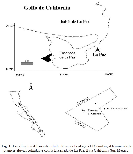 Área de estudio. El predio El Comitán cubre una superficie de 200 ha de vegetación silvestre propiedad del Centro de Investigaciones Biológicas del Noroeste (CIBNOR) que desde hace 25 años se ha destinado a la investigación biológica, por lo que su perímetro se encuentra cercado y aislada de la perturbación antropogénica. El predio se ubica al noroeste de la ciudad de La Paz, Baja California Sur; delimita con el fondo de la bahía de La Paz, de tal manera que recibe influencia ambiental marina. En algún periodo reciente, debido al activo tectonismo de la península, esta área estuvo bajo el nivel del mar y en la actualidad se considera una superficie de activo depósito aluvial (Hammond, 1954). Los límites del predio son las coordenadas 24°07'97"N/110°26'53"W al noroeste y 24°07'21"N/110°25'35"W al sureste (Fig. 1).
