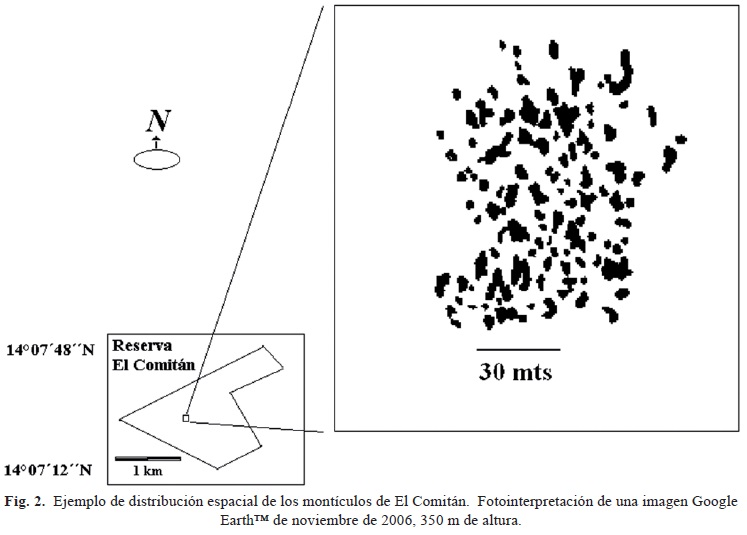 De acuerdo con la revisión que Aguiar y Sala (1999) hicieron acerca de la estructura en parches en las zonas áridas del mundo, los montículos de El Comitán pertenecen a la clasificación de parches en spot o leopardo, es decir parches de vegetación densa de forma circular irregular, isodiamétrica, tamaño variable, desde 1 m hasta 100 m de diámetro (Fig. 2). Rostagno et al. (1991), en la Patagonia, encontraron montículos de hasta 50 cm de altura, proponiendo que la altura es correlativa con la edad del montículo, lo cual no parece ser absolutamente cierto, pues autores como Parsons et al. (1992) y observaciones del presente trabajo, señalan que la altura puede estar en función de factores tales como la pendiente del sitio y la actividad de la fauna diversa, que en su oportunidad pueden rebajarlo o acrecentarlo.