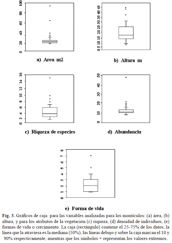Particularidades de los montículos. La Fig. 3 muestra diagramas de caja para las variables área y altura de los montículos, así como también riqueza de especies, densidad de individuos y número de formas de vida en ellos. Del análisis se desprende que casi el 75% de los montículos muestreados agrupan entre tres y siete plantas de dos a cinco especies distintas y de una a tres formas de vida, además de integrarse en una superficie entre tres y ocho m2, mismos que cuentan con una elevación sobre el nivel del suelo entre 10 y 25 cm.