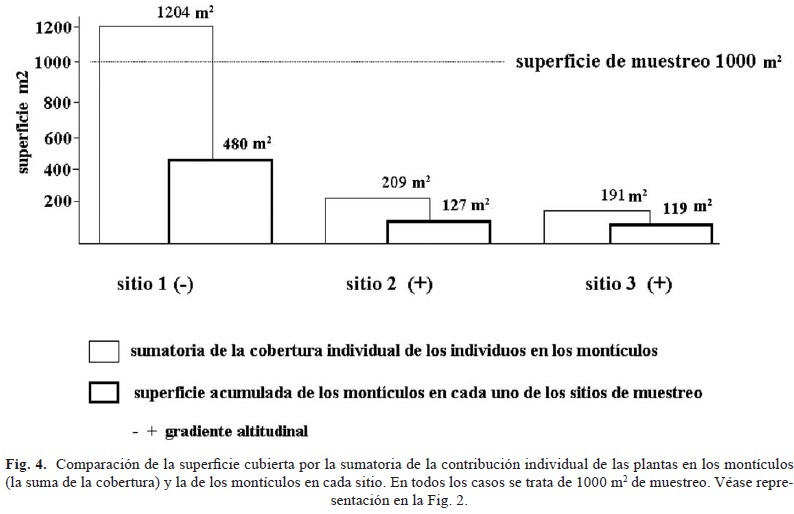 La Fig. 4 muestra esquemáticamente rasgos de cada uno de los tres sitios muestreados en relación con la superficie de muestreo (1000 m2). El área de los montículos representa sólo entre el 40 y el 60% de la sumatoria de la cobertura vegetal y entre el 15 y el 40% de la superficie de muestreo (1000 m2). Estas proporciones muestran la heterogeneidad de los sitios aunque estos se encuentran relativamente cercanos entre sí (véase Fig. 1).