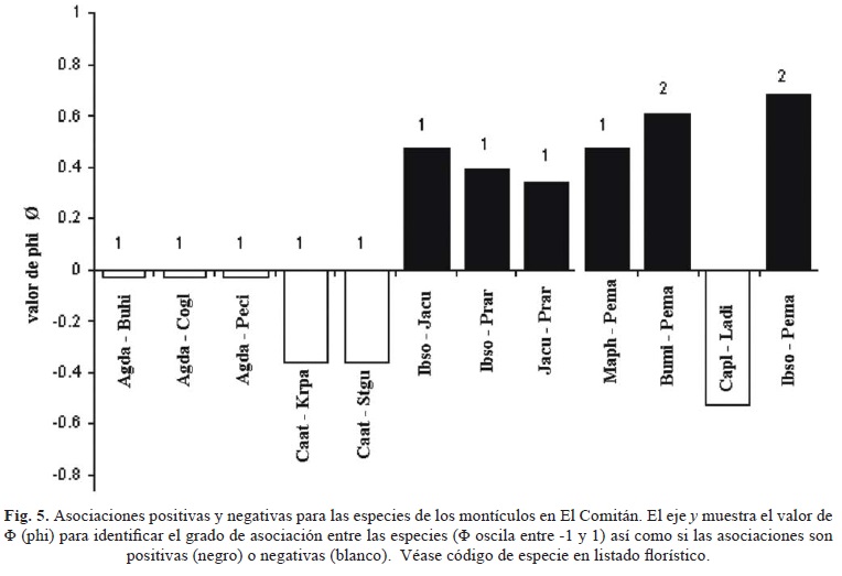 Derivado del análisis de la interacción de las especies, no se obtuvo un alto nivel en las asociaciones positivas entre pares de especies de plantas en los montículos, lo cual es congruente con las conclusiones de Monroy et al. (2007) para parches de vegetación en el Valle de Actopan, Méx., quienes afirman que cada parche de vegetación tiene su propia dinámica debido a la variabilidad estructural entre ellos. Adicionalmente, Callaway (1995) propone que la asociación entre especies es atribuible en mayor medida a razones de oportunidad, lo cual también concuerda con los resultados de este trabajo en el sentido de que sólo una baja proporción de especies se registran como una asociación de aparente dependencia específica. Esto es, el desarrollo de los montículos dependería, en primer plano, de la función de las colonizadoras o pioneras al modificar el entorno y hacerlo adecuado para la siguiente generación de especies: las facilitadoras o dominantes, mismas que conforman el montículo para permitir la agregación de las especies cuantitativamente subordinadas, cuyo establecimiento es, en gran medida, atribuido al factor oportunidad.