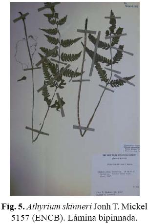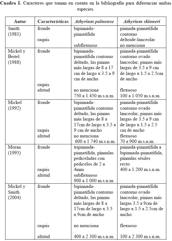Smith (1981) reconoce tres especies de Athyrium para la flora de Chiapas dentro de las cuales se encuentra Athyrium skinneri con lámina pinnado-pinnatífida. Ese autor menciona que algunos ejemplares de Chiapas han sido determinados como Athyrium palmense, una especie muy relacionada con A. skinneri, pero con lámina bipinnado-pinnatífida y raquis subflexuoso. Mickel y Beitel (1988) citan cuatro especies para Oaxaca, entre ellas las dos incluidas en este estudio y diferencian A. palmense y A. skinneri por el contorno y división de la lámina, que es pinnado-pinnatífida y ovado-lanceolada en A. skinneri mientras que es bipinnado-pinnatífida y deltoide en A. palmense, y por los rangos altitudinales: A. palmense crece entre 750 y 1450 m.s.n.m. y A. skinneri desde los 100 hasta los 1050 m de altitud. Mickel (1992) cita cuatro especies para Nueva Galicia, entre las que están también A. palmense y A. skinneri. Para esta última describe láminas pinnada-pinnatífidas, las pinnas más largas de 3.5 a 9 cm de largo x 1.5 a 2.5 cm de ancho, y un rango altitudinal que va desde los 70 hasta los 900 m.s.n.m., mientras que para A. palmense describe láminas bipinnado-pinnatífidas, de contorno deltoide, con las pinnas más largas de 8 a 17 cm de largo x 3.5 a 9 cm de ancho, con un rango altitudinal que va desde los 600 hasta los 1 740 m.s.n.m. Moran (1995) reconoce tres especies para Mesoamérica, dos de ellas las estudiadas aquí; este autor distingue A. palmense por la lámina tripinnado-pinnatífida, pínnulas pediceladas con pedicelos de hasta 4 mm y raquis subflexuoso, mientras que para A. skinneri menciona láminas pinnado-pinnatífidas a bipinnado-pinnatífidas y pínnulas sésiles y raquis recto; A. palmense crece en altitudes de 900 a 1 000 m.s.n.m. y A. skinneri entre los 400 y 1 200 m.s.n.m. Mickel y Smith (2004) citan cinco especies de Athyrium para México y distinguen las dos aquí estudiadas por los siguientes rasgos: A. palmense tiene lámina bipinnadapinnatífida de contorno deltoide, las pinnas más largas de 8 a 17 cm de largo por 3.5 a 9 cm de ancho y prospera en altitudes de 400 a 2 300 m.s.n.m. mientras que A. skinneri tiene lámina pinnada-pinnatífida de contorno ovado-lanceolado, las pinnas más largas de 3.5 a 9 cm de largo por 1.5 a 2.5 cm de ancho y se encuentra desde los 100 hasta los 2 300 m.s.n.m.