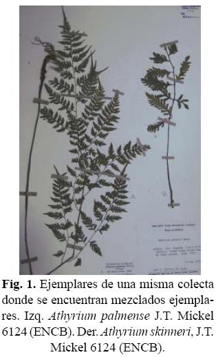 Con base en los datos provenientes de la bibliografía se puede apreciar que no existen caracteres que permitan distinguir claramente ambas especies (cuadro 1). En relación con la división de la lámina, existe un claro solapamiento del rasgo en las especies (figuras 2 a 6). (3, 4, 5). Así también, se encontraron ejemplares como el de Mickel 6124 (ENCB), figura 1, en que en una misma colecta se encuentran mezclados especímenes con diferente grado de división de la lámina, que siguiendo los criterios de Mickel y Beitel (1988), Mickel (1992) y Mickel y Smith (2004), correspondería el ejemplar de la izquierda a A. palmense y el de la derecha a A.skinneri, esto mismo ocurre con los especímenes de Mickel 3946, 6992 citados por Mickel y Smith (2004), y depositados en el herbario NY.