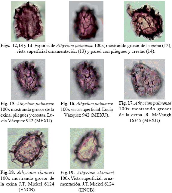 Tryon y Lugardon (1991) mencionan que las esporas de Athyrium presentan generalmente pliegues rugosos, y el perisporio externo frecuentemente se separa con el estrato rugulado y la capa más interna que queda expuesta. Las esporas de A. palmense y de A. skinneri son monoletes con perisporio crestado-plegado a claramente crestado, con muros sobresalientes, parcialmente anastomosados (rugulados), el tamaño de las esporas oscila entre 45 a 55 μm y el grosor del perisporio de 4.5 a 8.5 μm (Figs. 12 a 19). (13, 14, 15, 16, 17, 18) El número de pliegues y crestas es muy variable, entre 10 a 15 en ambas especies que pueden apreciarse con el microscopio de luz contando el número de crestas que se encuentra entre cada pliegue de la espora en vista proximal. Lo anterior nos lleva a concluir que los caracteres anatómicos y palinológicos tampoco nos brindaron elementos para poder separarlas.
