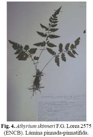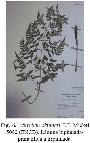 En cuanto a el contorno de la lámina que señalan Mickel y Beitel (1988), Mickel (1992) y Mickel y Smith (2004) para A. palmense como deltado tampoco es claro pues ejemplares identificados como A. skinneri como Mickel 5979 (foto 3), Mickel 6124 (foto 1) y Mickel 5082 (foto 6) tienen el contorno de la lámina deltado. El tamaño de las pinnas más largas, que según Mickel y Beitel (1988), Mickel (1992) y Mickel y Smith (2004), para A. palmense son de 8 a 17 cm de largo x 3.5 a 9 cm de ancho y para A skinneri de 3.5 a 9 cm de largo x 1.5 a 2.5 cm de ancho, al tomar medidas de los ejemplares de herbario estas dimensiones se solapan, por ejemplo, el espécimen de Lorea 2568 identificado como A. palmense, las hojas más largas son de 10.5 cm de largo x 2.7 cm de ancho, y el ejemplar de Mickel 5979 de A. skinneri las hojas más largas miden 10 cm de largo x 1.8 cm de ancho. El carácter de las pinnulas sésiles o pediceladas es frecuente encontrar en las pinnas inferiores pinnulas cortamente pediceladas y en las pinnas superiores pinnulas sésiles.