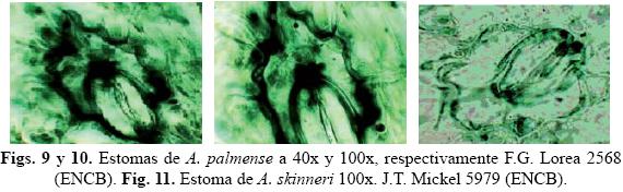 El género Athyrium ha sido colocado en la familia Aspleniaceae (Van Cotthem, 1973) y en cuanto a los tipos de estomas que pueden presentar los integrantes de esta familia se mencionan los anomocíticos y polocíticos. En las especies de estudio se encontraron estomas polocíticos, que se caracterizan por presentar una célula subsidiaria rodeada por células epidérmicas de paredes onduladas, de tal forma, que tanto A. palmense y A. skinneri presentan la misma morfología interna de tallo y de tipos de estomas (Figs. 9, 10 y 11).