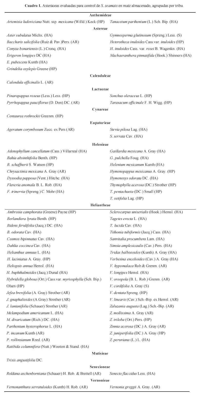 En lo que respecta a la tribu Helenieae, sobresalieron los polvos foliares de Chrysactinia mexicana (98% de mortalidad) y Adenophylum cancellatum (73.8%); así, como los polvos florales de Thymophylla pentachaeta y Flaveria trinervia, con mortalidad de 78.3 y 71.3%, respectivamente.