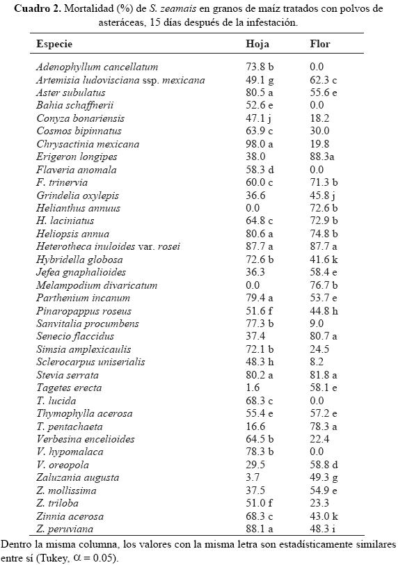 Los datos de mortalidad indicaron diferencias (p < 0.05) entre tratamientos; con base en la comparación múltiple de medias (cuadro 2), los mejores tratamientos al respecto fueron los provenientes de especies de las tribus Heliantheae, Helenieae y Asteraceae.