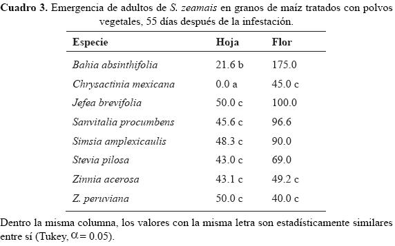 En general, los tratamientos que causaron los porcentajes más bajos de emergencia de S. zeamis (cuadro 3) fueron los polvos foliares, los cuales a su vez tendieron a causar la mayor mortalidad que los polvos florales; al respecto, Chrysactinia mexicana destacó ampliamente. Las excepciones notables a esta tendencia fueron Bahia absintifolia, Stevia pilosa y Jefea brevifolia con 14.0, 1.7 y 0.0% de mortalidad, respectivamente; por su acción exclusivamente insectistática (Silva et al., 2003).