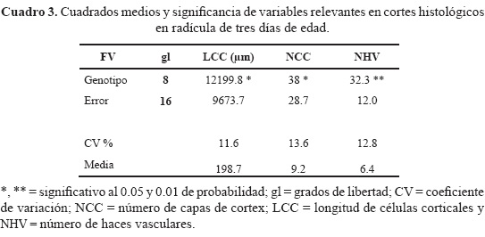 El DR (diámetro de radícula) no se correlacionó con NCC (r = 0.04) es decir, que el genotipo con mayor diámetro no presentó el mayor número de estratos del córtex. La asociación de DR con NHV fue positiva y significativa (r = 0.62, P ≤ 0.05) resaltando la asociación entre estas dos variables, aunque el DR, por sí solo, no presentó diferencias entre genotipos.