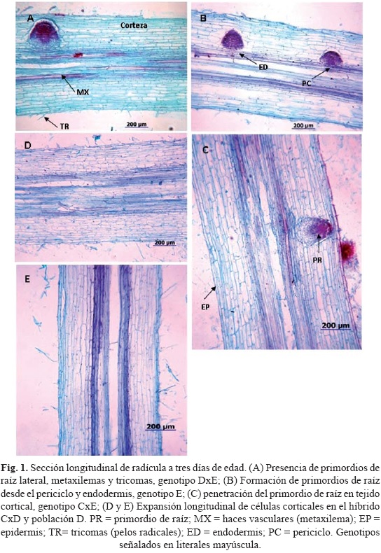 Los primordios radiculares iniciaron su desarrollo a los tres días de edad (Fig. 1A) y no presentaron diferencias significativas entre genotipos. No obstante, la mayor densidad de los mismos fue registrada en híbridos entre E y los PE, tanto en cruzas directas como recíprocas; el promedio de éstos fue 11 primordios en 5 cm de radícula, valor superior a los que exhibieron los materiales PE como tales.