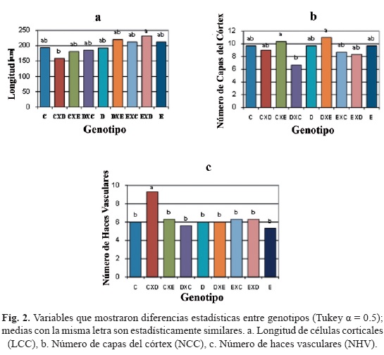 El análisis de varianza (cuadro 3) presentó diferencias estadísticas entre genotipos (P ≤ 0.05) sólo en las variables LCC, NCC y NHV; la comparación de medias (Tukey, α = 0.05) exhibió que el genotipo DxE fue el más alto para la variable LCC y que CxD presentó valores nominales altos para LR, no obstante que este híbrido ocupó el último lugar en LCC (Figs. 1D, 2a). En cuanto a NCC, las combinaciones más sobresalientes fueron DxE y CxE (Fig. 2b). Por otra parte, es razonable suponer que el NCC se correlacione positivamente con DR, aunque en este estudio, los genotipos de mayor número de estratos del córtex, no presentaron el mayor diámetro de radícula. Por último, para NHV la combinación CxD presentó la mayor cantidad de estas estructuras (Fig. 2c), incluso muy superior a genotipos de su misma condición PE.