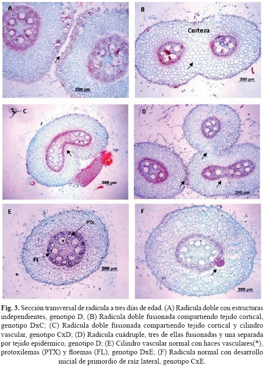 Es relevante señalar que en esta etapa de desarrollo del sistema radical seminal, los genotipos de maíz PE mostraron diferentes tipos en la formación de radículas múltiples, los cuales se presentaron como independientes entre sí, o con cierto grado de fusión (Fig. 3A). Entre las variantes de radículas múltiples observadas fue posible documentar los casos siguientes: 1) dos radículas independientes, que se mostraron completamente normales; 2) dos radículas que comparten tejido cortical, pero cilindro vascular independiente; 3) dos radículas que compartían tanto el tejido cortical como el cilindro vascular. Es importante subrayar que estas tres variantes de radícula múltiple observadas corresponden a casos generados a partir de una semilla (Fig. 3D). En contra parte, los maíces comunes (E o sus cruzas con C y D) desarrollaron invariablemente sólo una radícula por semilla, anatómicamente normal (Figs. 3E, F).