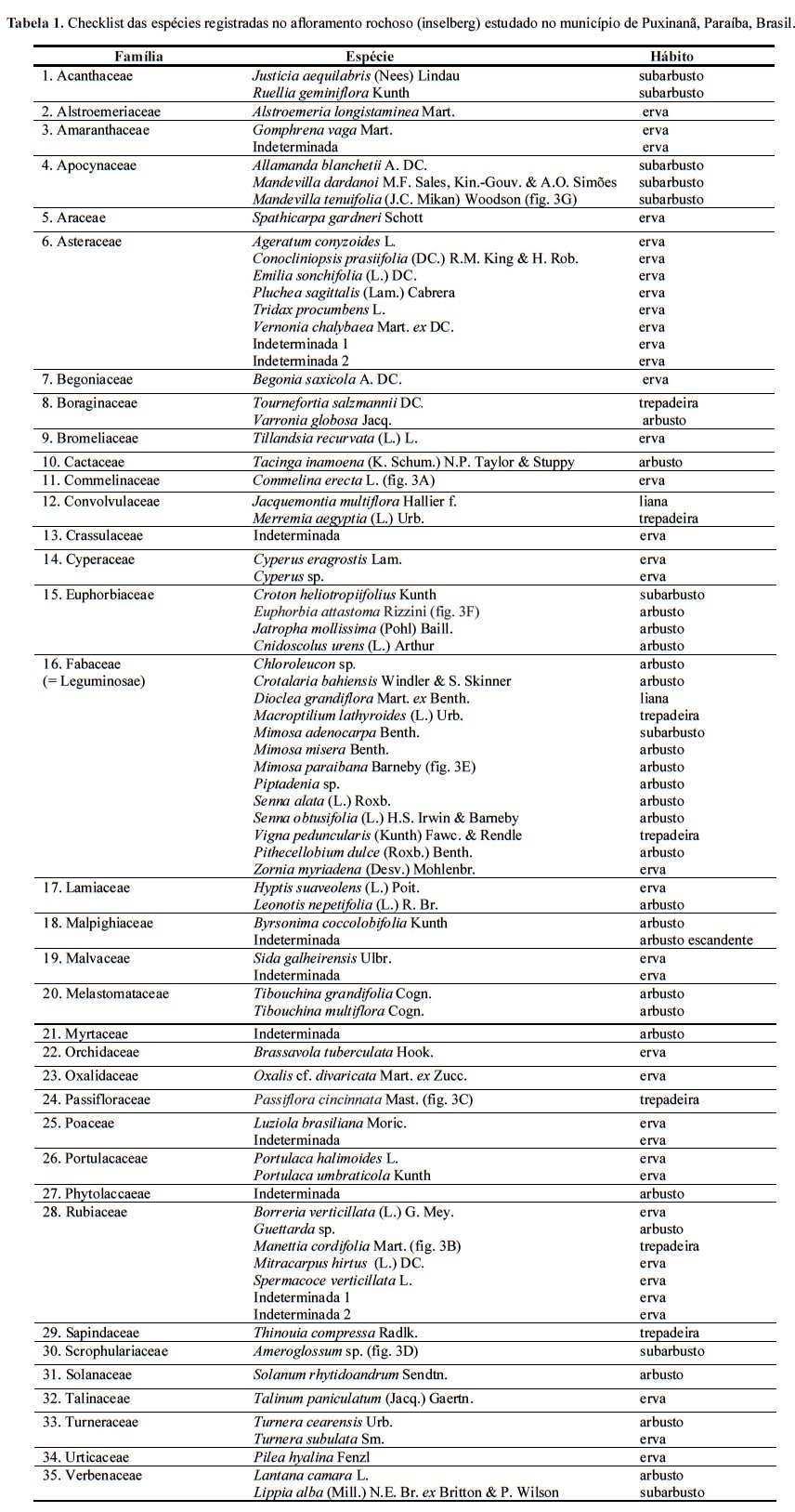Com relação às famílias registradas nesse estudo, verificou-se semelhança com o estudo de Araújo et al. (2008), realizado em um inselberg localizado em Quixadá, região semiárida do Estado do Ceará, Brasil. Os autores registraram 77 famílias, 19 delas encontradas no presente trabalho sendo a família Fabaceae dominante com o mesmo número de espécies (11) registradas neste trabalho, seguida das famílias Poaceae e Euphorbiaceae.