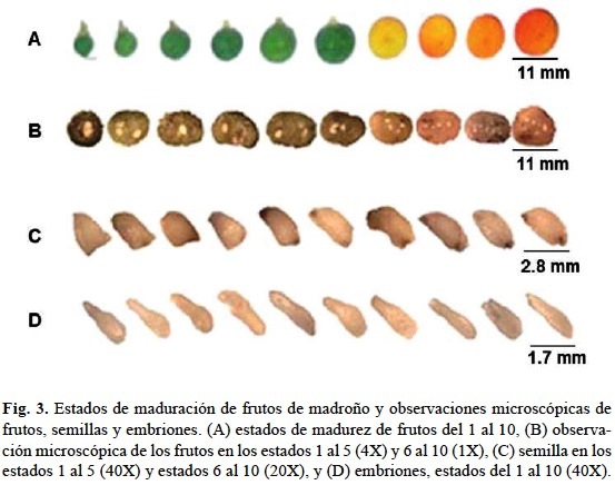 Como no existía una escala de clasificación de frutos para madroño, primeramente se realizó un análisis del peso (g), tamaño (mm) y color de 60 frutos de cada árbol, y de esta manera nos permitió obtener un sistema de clasificación en 10 estados de maduración de frutos. Posteriormente, los frutos de cada estado fueron seccionados de manera longitudinal para exponer las semillas y embriones y poder observarlos en un microscopio compuesto (Leica DM 1000) a aumentos de 20X y 40X, esto con la finalidad de corroborar el grado de desarrollo de las semillas y de sus respectivos embriones para cada uno de los 10 estados establecidos anteriormente.