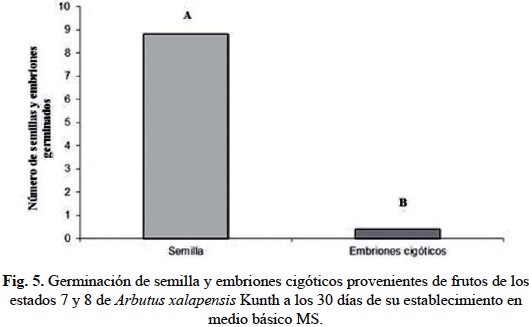 De manera opuesta a lo observado con la semilla, se encontró que la germinación de los embriones cigóticos, extraídos de las semillas y sembrados en un medio MS, disminuye de manera considerable (0.4 embriones/unidad experimental) (fig. 5), por lo que es muy probable que el medio de cultivo influya más en su germinación que el estado de desarrollo del embrión. El madroño es una especie leñosa para las que se ha observado que el medio de cultivo es fundamental en las repuestas morfogenéticas in vitro de los embriones. Por ejemplo, los embriones cigóticos de varias especies de pinos requieren de medios suplementados con maltosa, nitrato de plata, nitrato de magnesio y casa aminoácidos para su germinación, formación de callo o bien para la formación de embriones somáticos (Ramarosandratana et al., 2001a; Pullman et al., 2003; Miguel et al., 2004; Niskane et al., 2004; Lelu-Walter y Bernier-Cardou, 2006). En casos específicos como el reportado por Pulman et al. (2003) en Pinus tadea L, para que los embriones cigóticos puedan establecerse se requiere de un medio suplementado con mio inositol, ácido abscísico y nitrato de plata, donde además consideran que el estado de maduración de éstos es fundamental para la iniciación de los cultivos, ya que los embriones inmaduros producen mayor cantidad de callos embriogénicos, condición que también se ha observado por Lelu-Walter y Bernier-Cardou, (2006), en Pinus pinaster Ait. Una especie no leñosa para la que se ha observado la importancia del estado de desarrollo de los embriones es Glycine max (L.) Merrill. Para esta especie se encontró que la germinación es mayor en los embriones cigóticos provenientes de semillas más maduras (90%) que en los provenientes de semillas inmaduras (43%), condición que se mantiene siempre y cuando los embriones sean cultivados en un medio B5 (Gamborg) conteniendo 1% de sacarosa (Tekrony et al., 1996).
