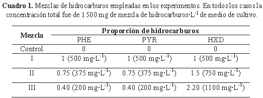 Se trabajó con 30 réplicas para cada relación de hidrocarburos. Los tubos se mantuvieron abiertos en la campana de extracción durante 1 h a fin de evaporar el diclorometano, después se esterilizaron durante 15 minutos a 1.2 kg&•cm-2.