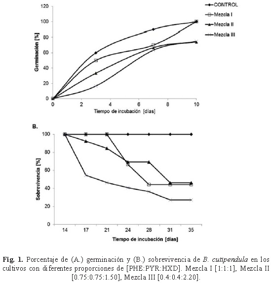 Los cultivos de vegetales in vitro permiten estudiar con mayor facilidad, en la ausencia de los microorganismos del suelo, el impacto que producen los contaminantes, en este caso los HC, en las respuestas de las plantas simplificando los modelos de estudio. En este estudio, se encontró que la elevada concentración de HC empleada logró una disminución en la longitud y producción de biomasa en brotes y raíces de B. cutipendula demostrando con ello que una mayor concentración de HXD en el medio de cultivo incrementa el efecto tóxico de la mezcla.