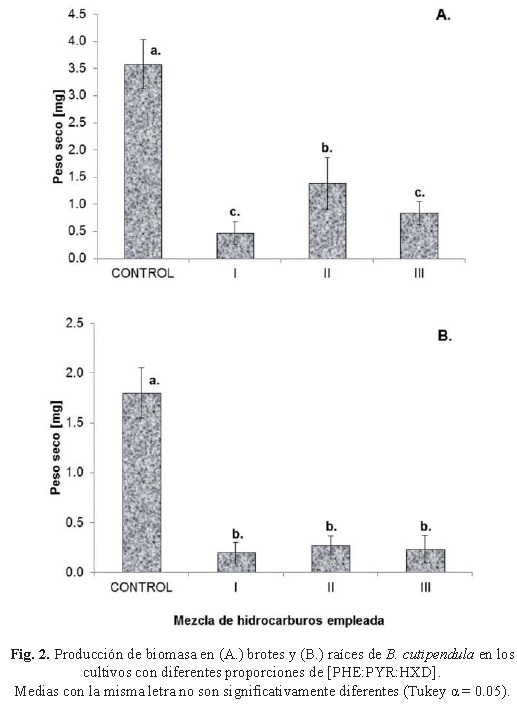 Se sabe que el éxito en la germinación no garantiza un subsecuente sano desarrollo de las plantas (Merkl et al., 2005). Trabajos anteriores de Chaineau et al. (1997) han demostrado una correlación entre la baja germinación de plantas y su pobre crecimiento en suelos recientemente contaminados, esta misma correlación se obtuvo en los cultivos de B. curtipendula donde se observó una disminución de más del 80% en el peso seco tanto de brotes como de raíces (fig. 2A y 2B respectivamente). Los hidrocarburos poliaromáticos provocan una disminución significativa de la producción de biomasa en especies de leguminosas y pastos (Sang-Hwan et al., 2007). Estudios previos (Smith et al., 2006) han mostrado una disminución en más de 70% de la producción de forraje con respecto al control en especies de pastos cuando se cultivan en suelos contaminados con 1 000 mg de HC-kg-1 de suelo, lo cual es congruente con lo observado en este estudio donde los resultados sugieren que la biodisponibilidad es mayor, probablemente debido a las características mismas de nuestros cultivos in vitro y que la concentración de hidrocarburos es 50% mayor, en nuestro caso, a dicho estudio.
